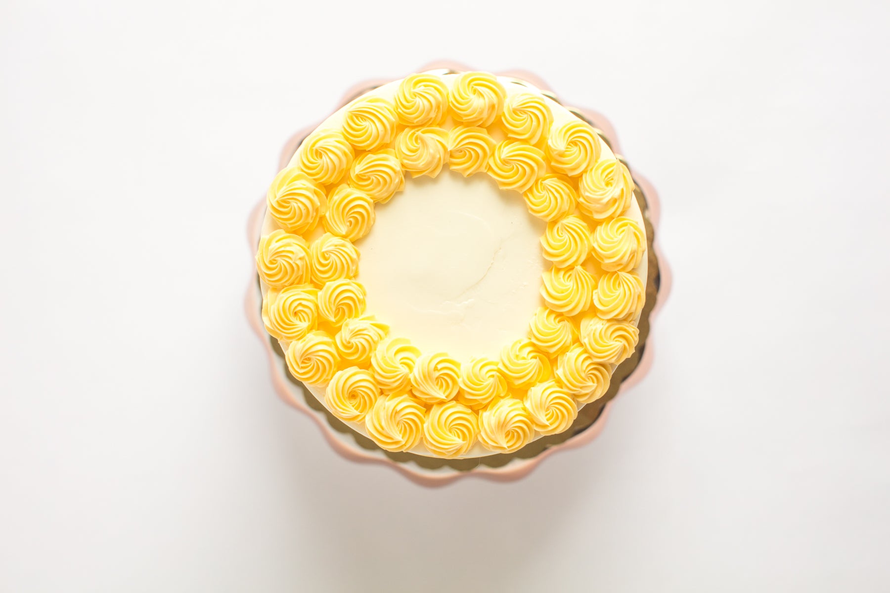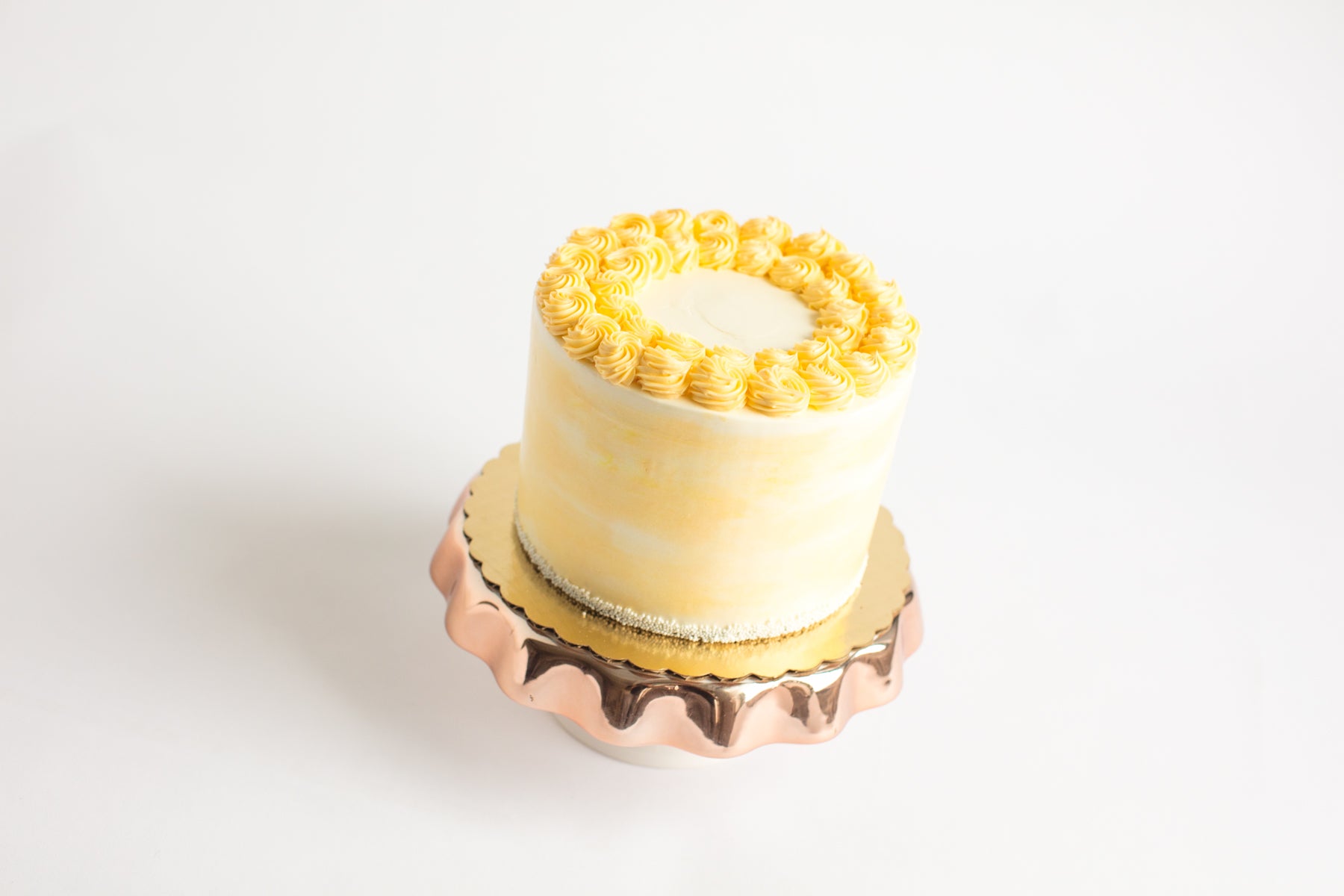 Lemon cake soaked in lemonade syrup and filled with layers of vanilla bean buttercream and lemon curd. Iced in vanilla buttercream and topped with buttercream rosettes and non pareil sprinkles.